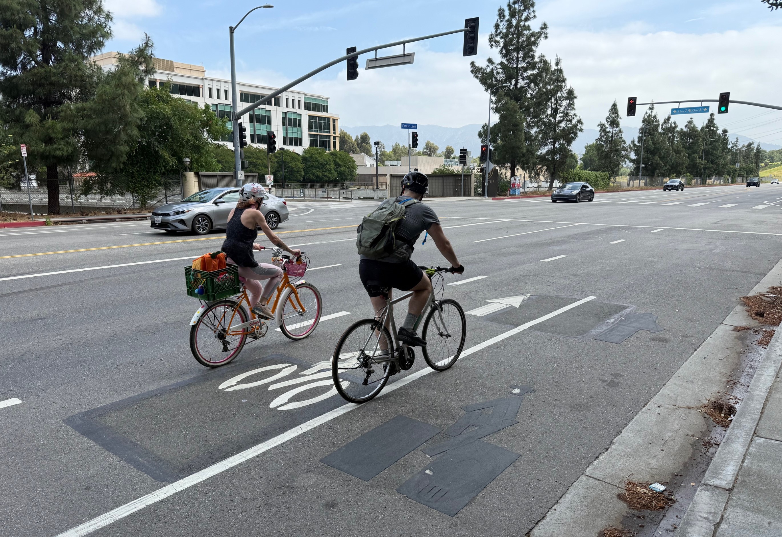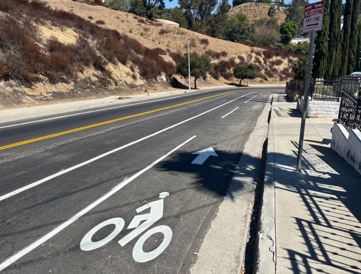 In 2020, when LADOT was re-striping part of Forest Lawn Drive (adding a small buffer along existing bike lanes) the city mistakenly painted a bike symbol in the wrong lane on this part of Forest Lawn Drive. I shared the "typo" with DOT staff who moved the symbol to the correct place.