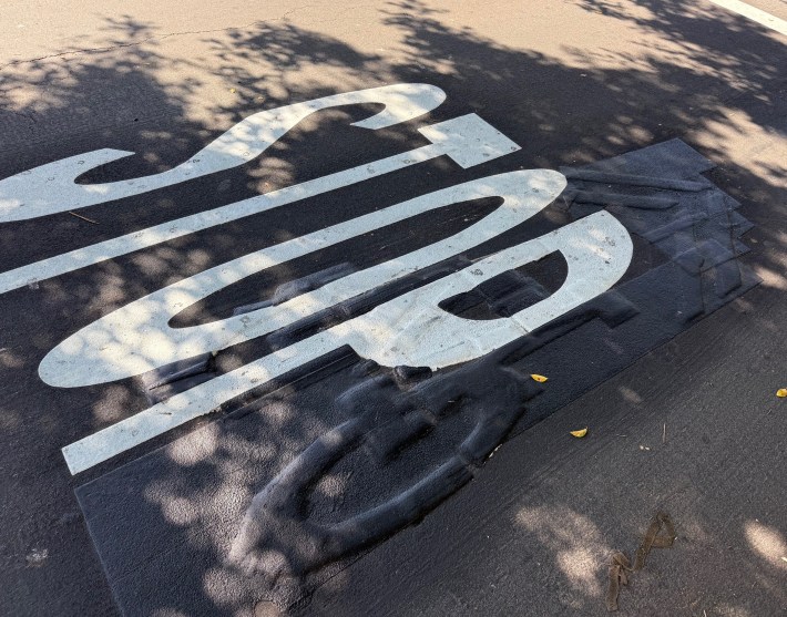 Occasionally, I have spotted city mistakes on newly installed bikeways. When I see these, I communicate them to DOT staff, who get the typos corrected. I bring these up here not to get anyone in trouble (I do more than my share of typos and corrections), but because I when I bike in these places I still notice traces of the earlier markings.