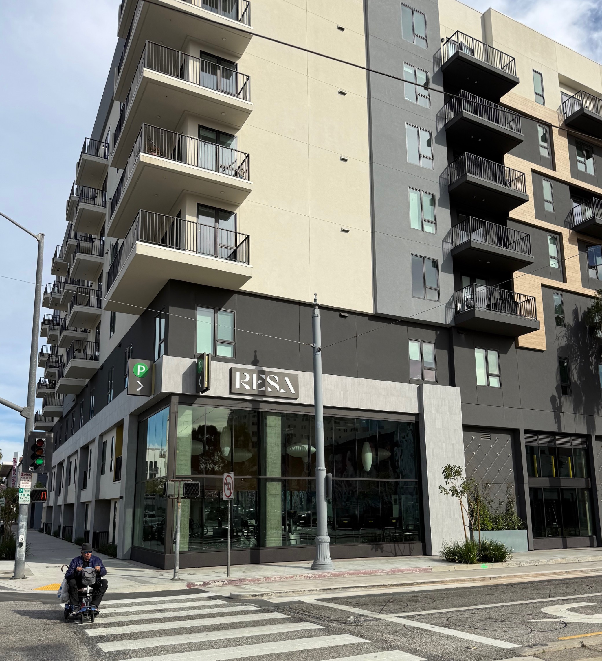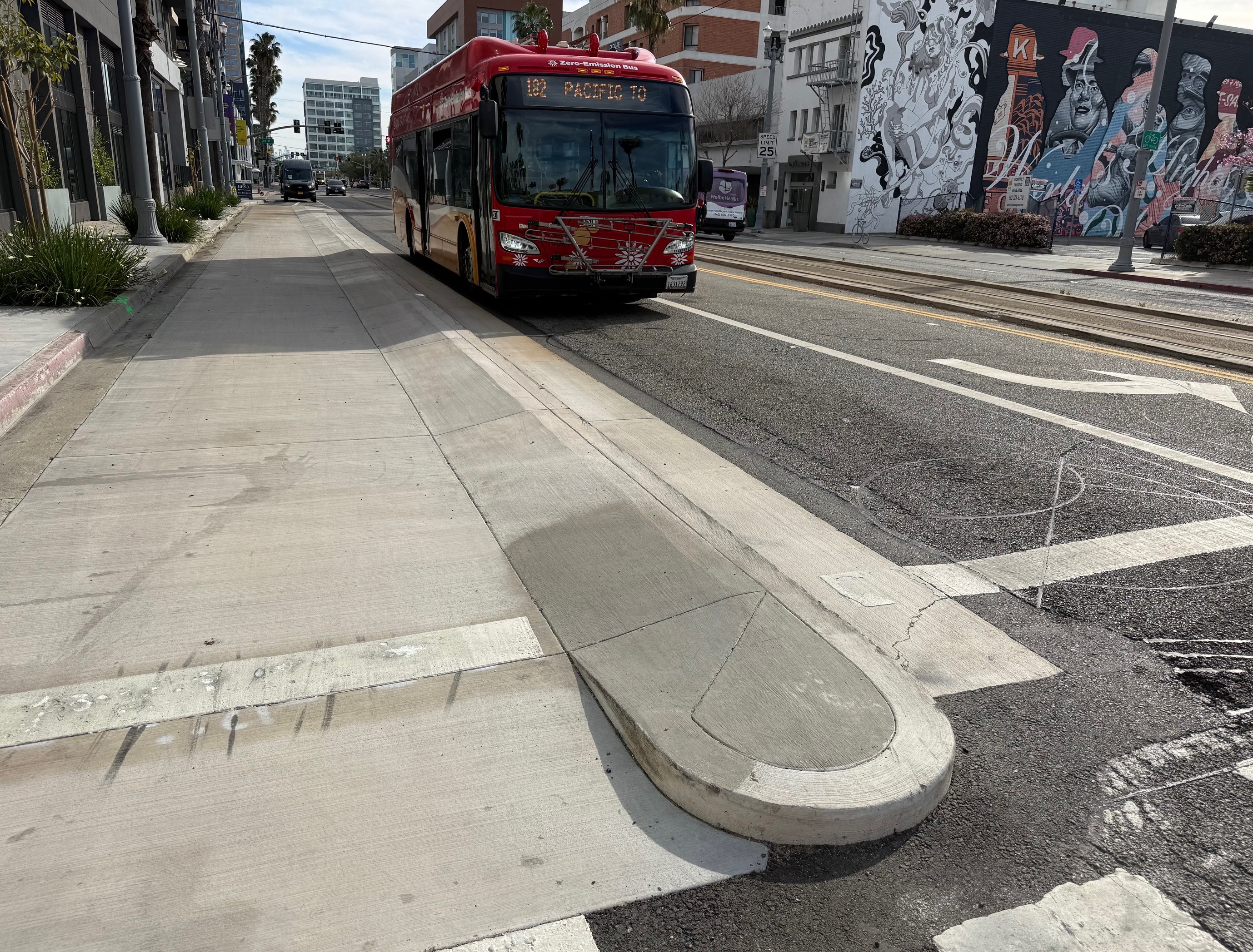 Today, SBLA shares one more example. It's at the Resa, a mixed-use transit-oriented development in downtown Long Beach. The building opened last year, as did one block of new concrete-curb-protected bike lane along the development's Pacific Avenue frontage. The bikeway makes a first/last mile connection to the adjacent Metro A Line Pacific Avenue station.