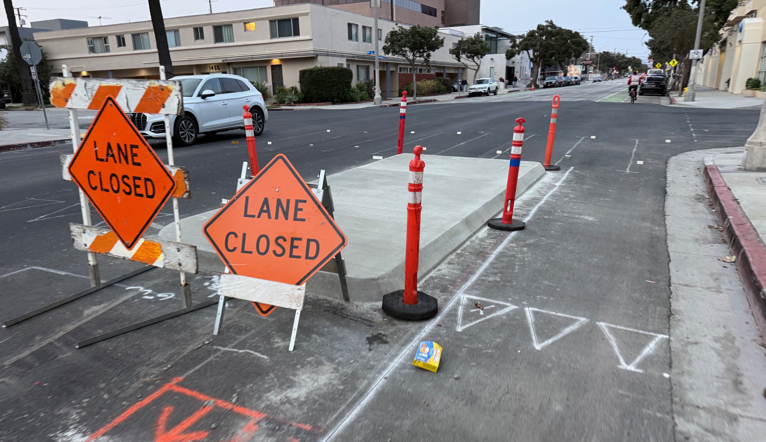Just a block to the north, Santa Monica has construction well underway for a much more extensive bike/walk project: the Broadway Protected Bike Lane Project, also called the Broadway Safety Project. That 1.6-mile project extends from 5th Street to 26th Street. Broadway already had continuous bike lanes – mostly unprotected with a few parking-protected blocks. The full length will be upgraded to parking-protected, including some concrete curb-protected areas.