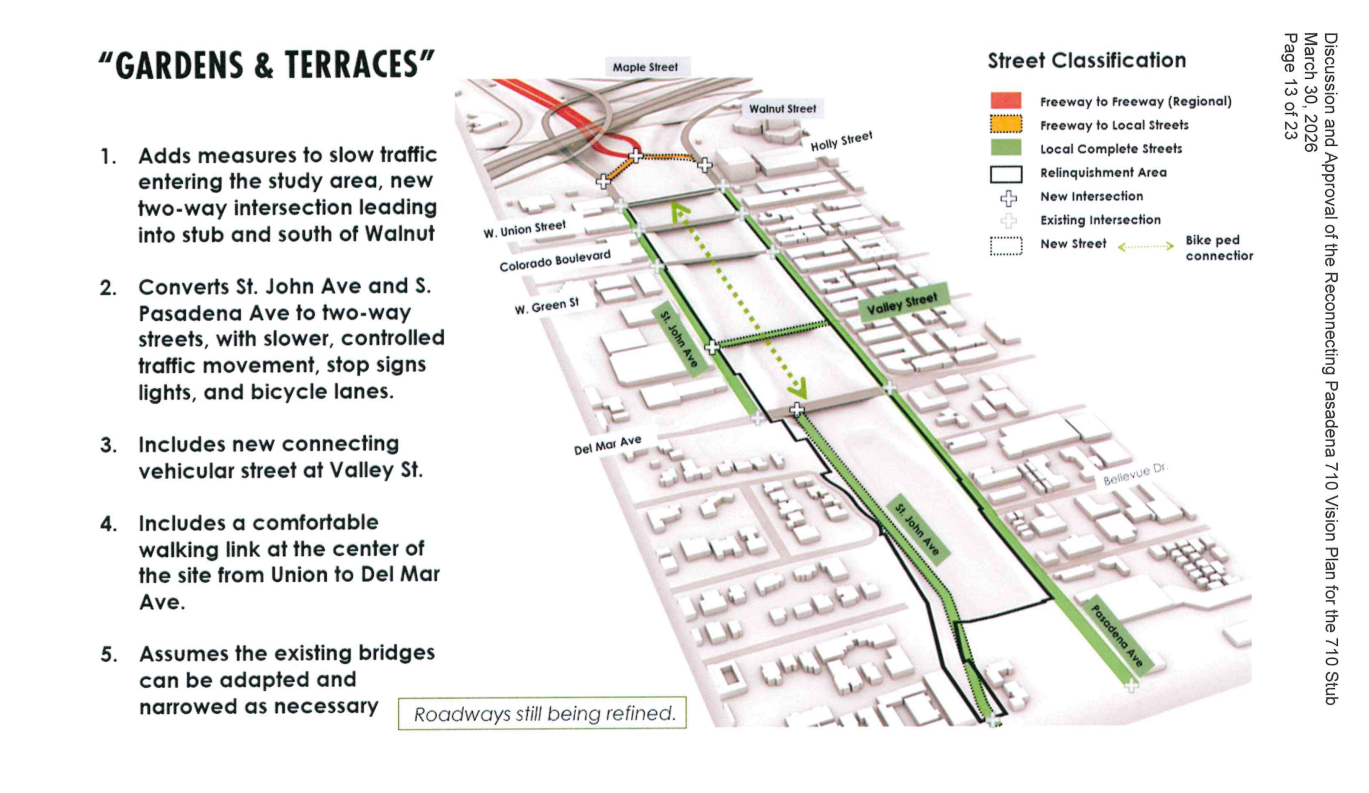 “Gardens & Terraces” would slow traffic entering the area from the 210 with a stop light, and convert St. John Avenue and Pasadena Avenue into two-way streets to handle north-south traffic. The existing bridges (previously Caltrans assets) would be maintained as they are, and a proposed walk-bike path would run below them in the middle of the Stub.