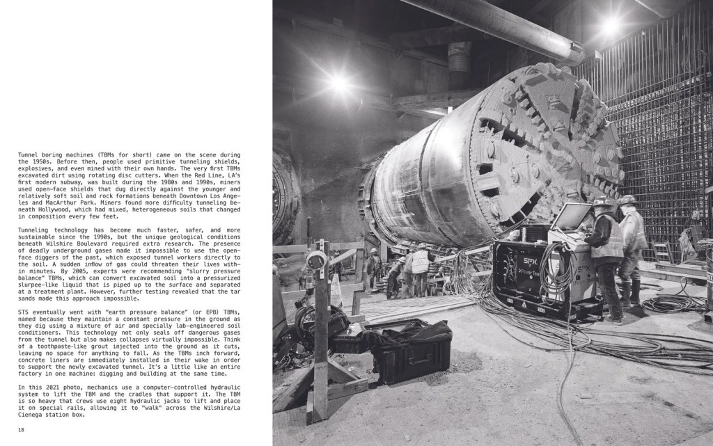 The book documents how D Line Section 1 workers successfully bored their way through challenging soils near the La Brea tar pits. Various obstacles – including oil saturated sands, methane gas, and a high water table – slowed tunnel boring to half of its typical 60 feet per day.