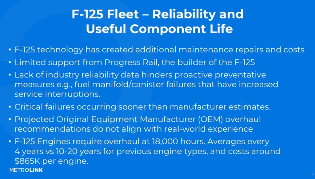 Recently Metrolink has experienced reliability issues with its newer diesel locomotives.